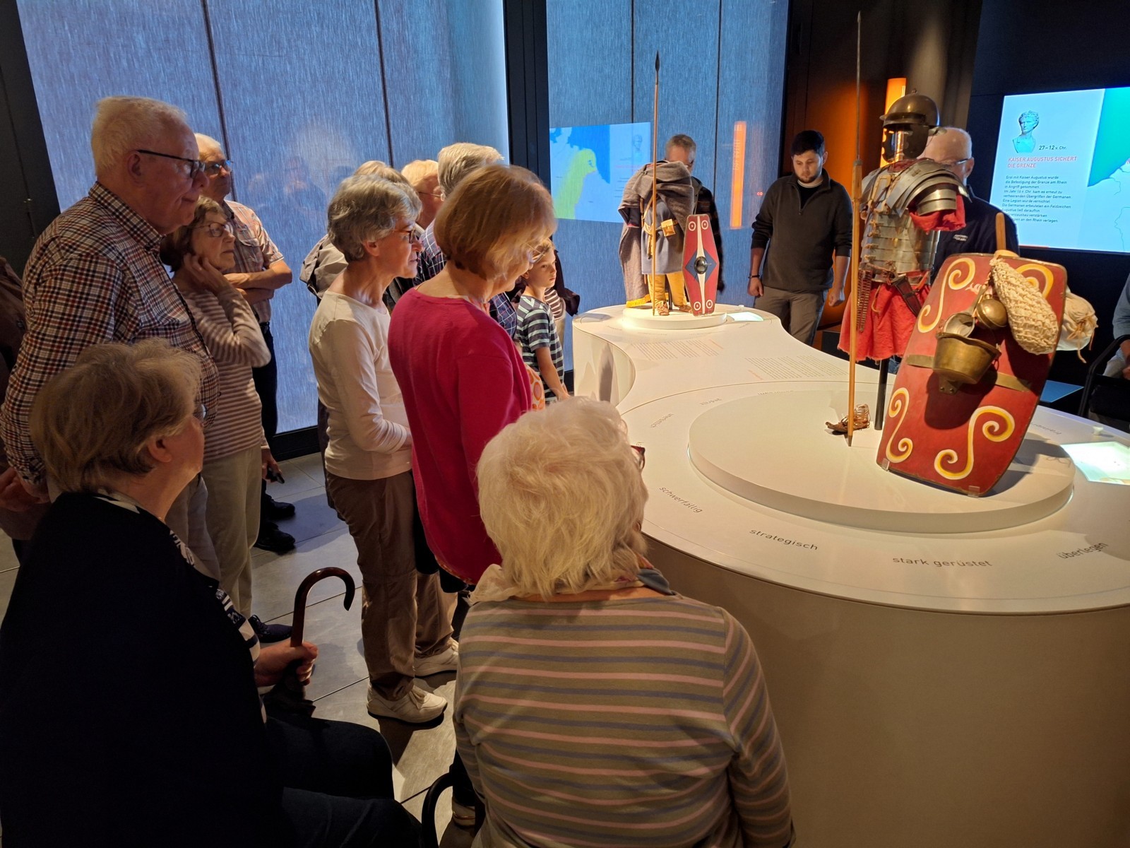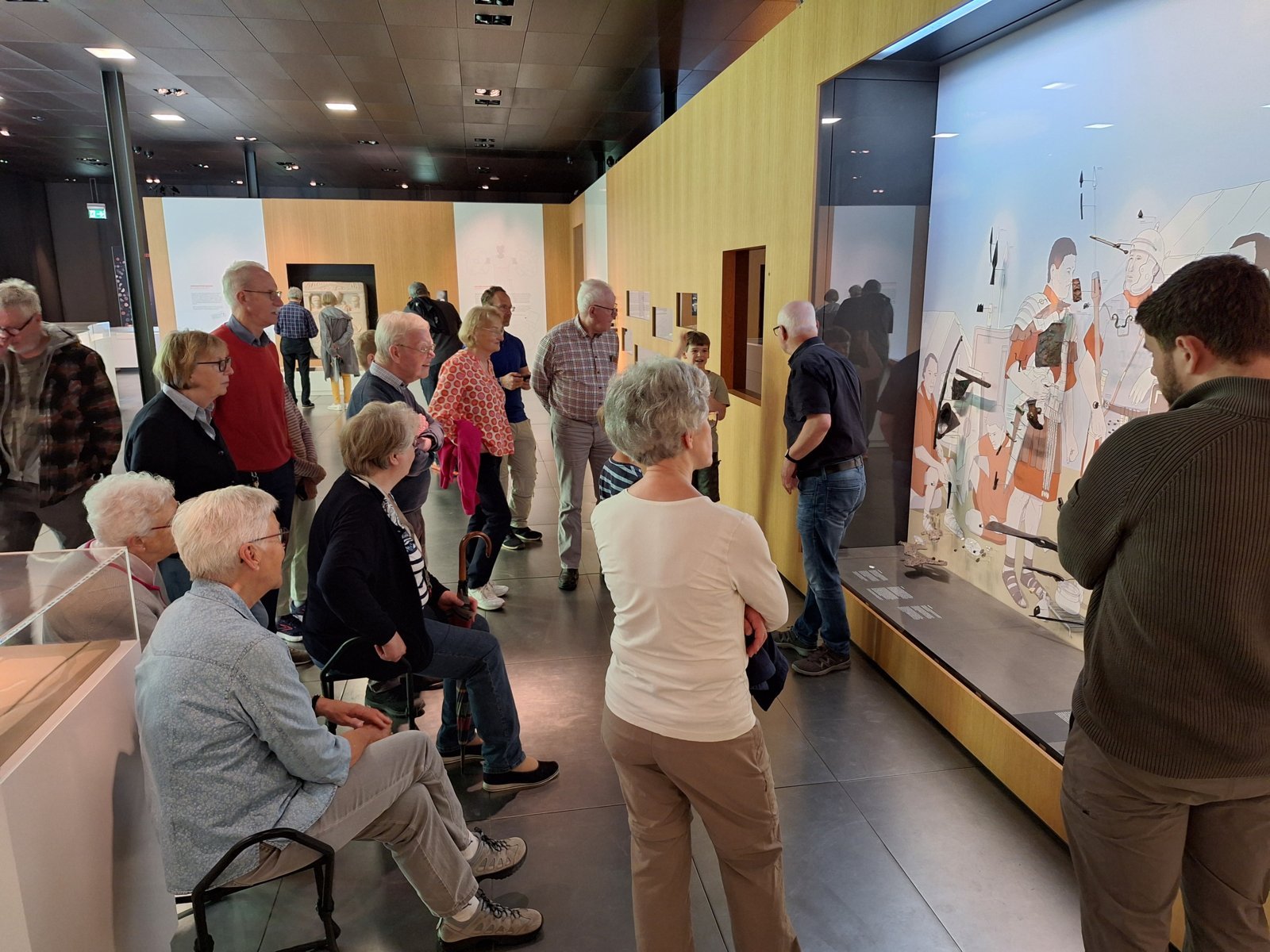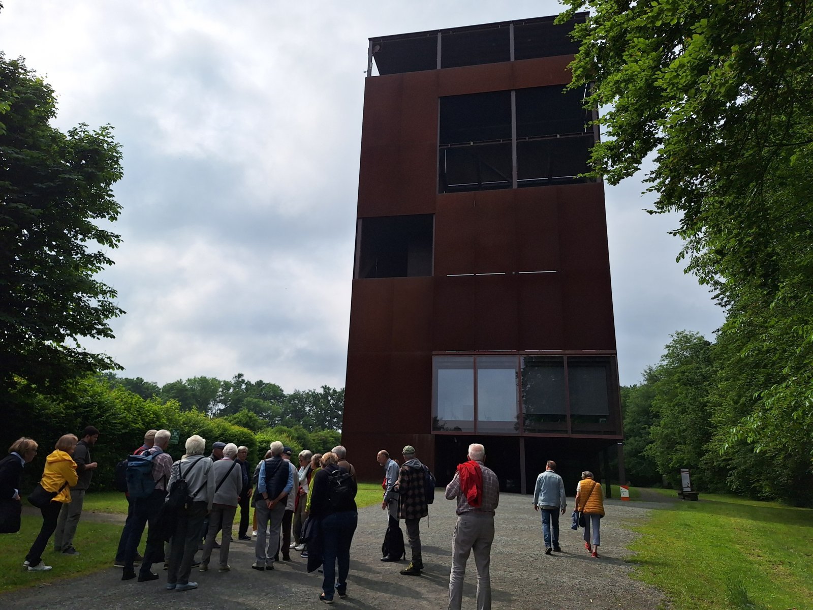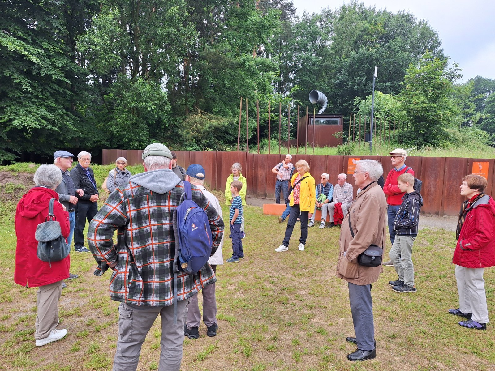 Die Teilnehmer/innen erkundeten zunächst unter Leitung von Dr. Wilhelm Bauhus und einem Führer in Kalkriese im archäologischen Park, auf dem imposanten Aussichtsturm und im Museum mit der ikonischen Silbermaske eines Centurios, wie sich mit innovativen Methoden das Schlachtfeld rekonstruieren lässt. Nach der Mittagspause im Gasthaus Varusschlacht führte Dr. Bauhus die Gruppe nach Westerkappeln im Tecklenburger-Land, um ein Ausgrabungsgelände der Jungsteinzeit zu besichtigen. Die Sloopsteene sind ein erst kürzlich wieder neu erforschtes Megalithgrab. Auf der Rückfahrt nach Roxel stand zum Schluss noch ein Gang zum Alten Eisenbahntunnel Lengerich auf dem Programm. Von 1941 – 1944 und in den letzten Kriegstagen Ende März 1945 nutzte die Lengericher Bevölkerung den alten Eisenbahntunnel als Zufluchtsort vor den Bombenangriffen.Zwischen März 1944 und Ende März 1945 wurde der Tunnel im Zuge der kriegsbedingten Untertage-Verlagerung der Produktion von Kriegswaffen als KZ-Außenlager von Neuengamme genutzt. 2015 wurde der Alte Tunnel unter Denkmalschutz gestellt.