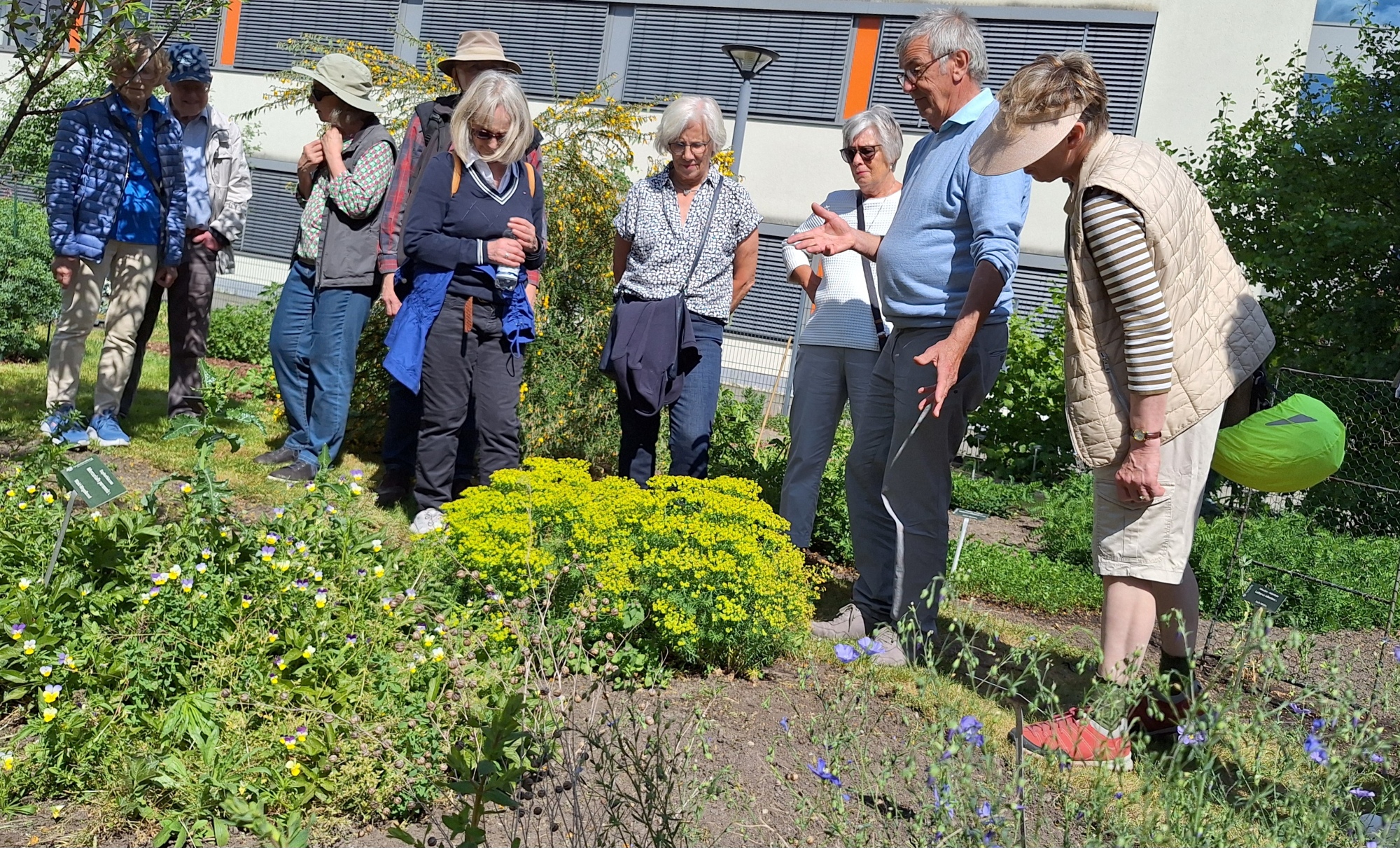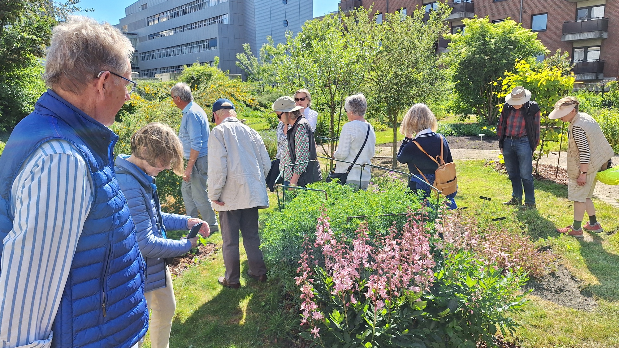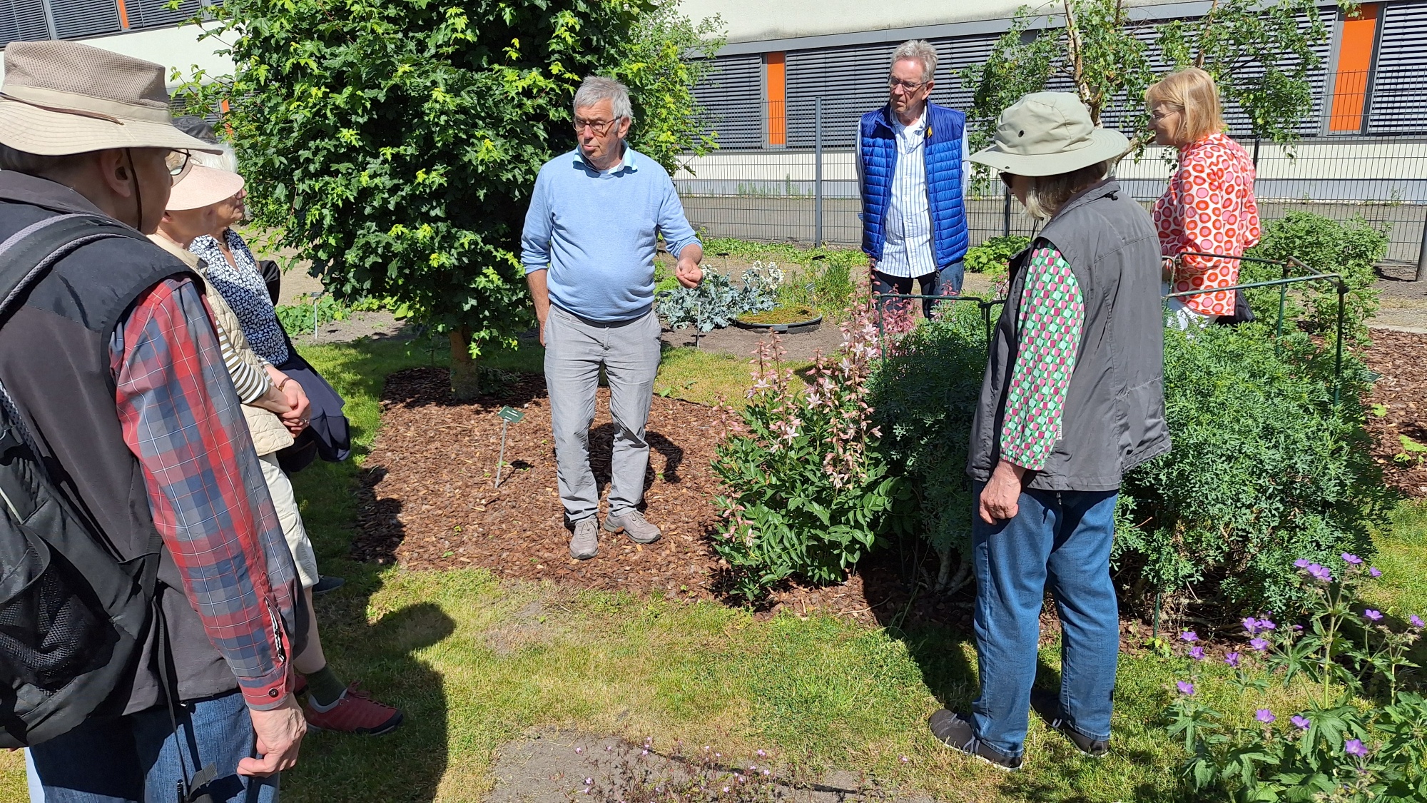 Der 2018 an der Corrensstraße neu eröffnete Arzneipflanzengarten bietet Studierenden der Pharmazie und Lebensmittelchemie auf dem Außengelände und im Gewächshaus über 400 lebendige Anschauungsobjekte aus dem Bereich der Arznei-, Gift- und Nutzpflanzen. Dr. Rolf Engelshove erläuterte bei seiner Führung den Einsatz und die Wirkung pflanzlicher Arzneimittel von der Kräutermedizin bis hin zur modernen Pharmazie.